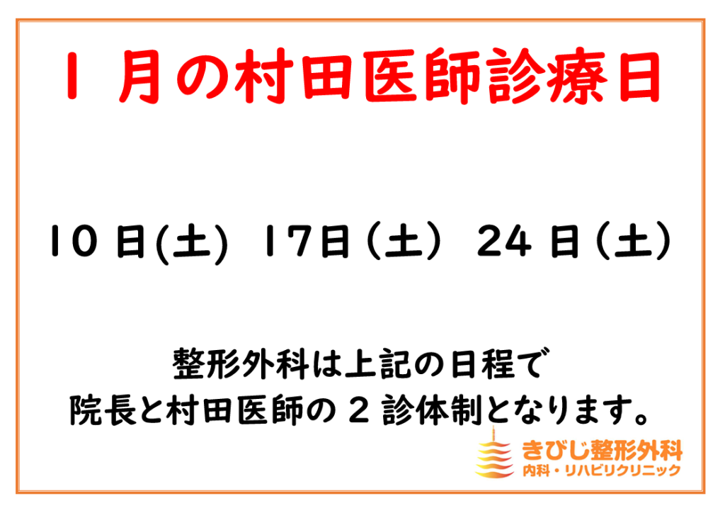 (整形外科)1月の土曜日の2診体制日:1/10(土)、1/17(土)、1/24(土)