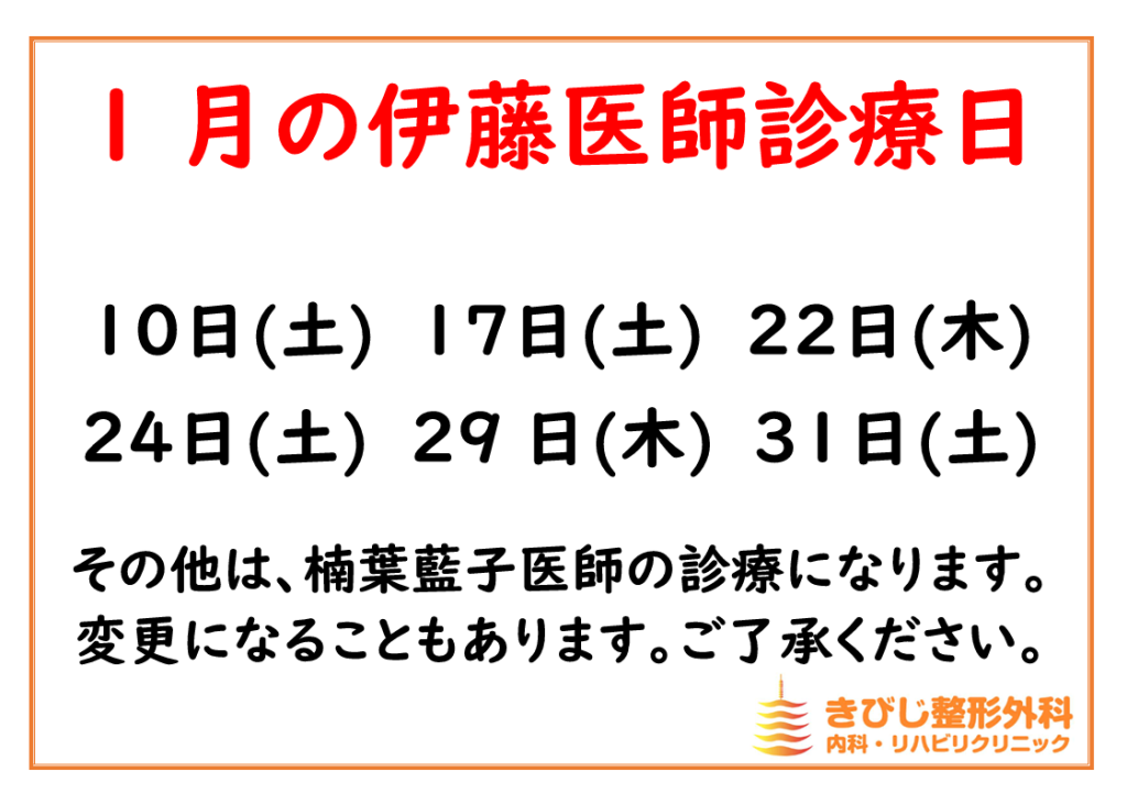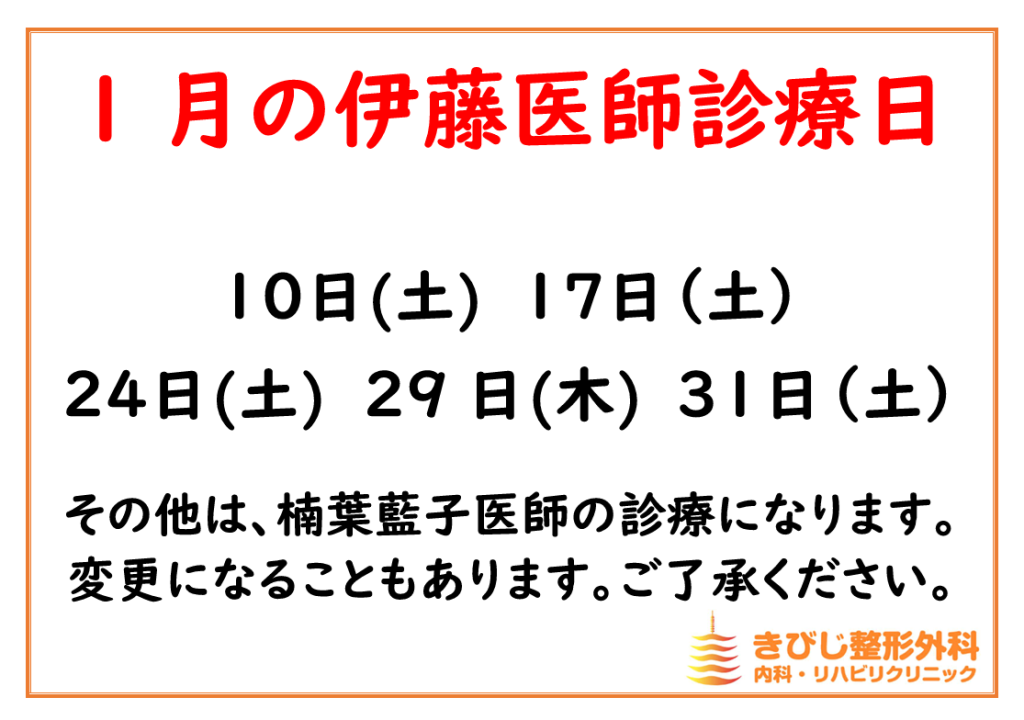 (整形外科)1月の土曜日の2診体制日:1/10(土)、1/24(土)
