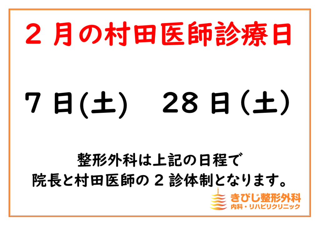 (整形外科)2月の土曜日の2診体制日:2/7(土)、2/28(土)